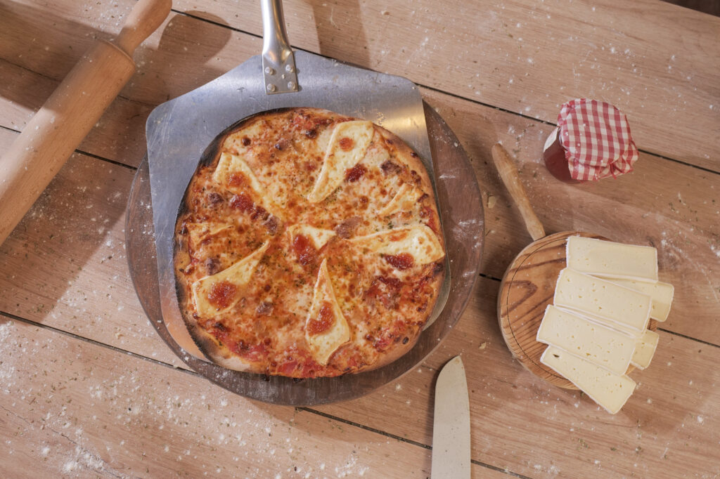 Tómate, mozzarella, queso Brie, queso ricota, queso rulo de cabra, queso Roquefort, queso Grana Padano, Nuestra Mermelada de bacon