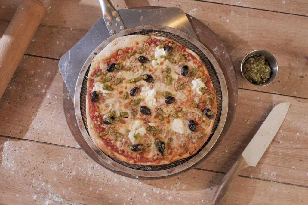 Tómate, mozzarella, queso ricota, atún, olivas negras, cebolla caramelizada, Pesto.
